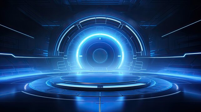 Futuristic digital interface with concentric blue neon circles and data