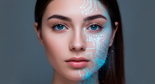 Woman's face with circuit board design overlay, representing technological integration and future concepts.