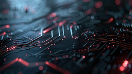 High-tech black circuit board featuring glowing red lines and intricate electronic pathways