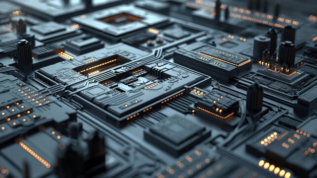 This image features a highly detailed, futuristic circuit board with illuminated pathways and electronic components, suggesting advanced technology