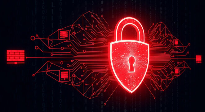 Secure your digital world with this dynamic cyber threat protection graphic featuring a glowing red padlock and circuit board elements against a binary code backdrop