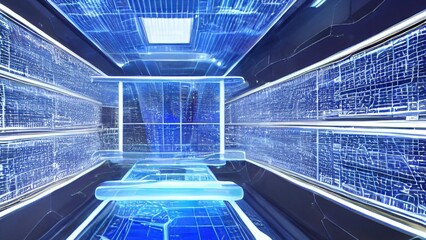 Floating holographic hud over server aisle showing futuristic blue circuit interface