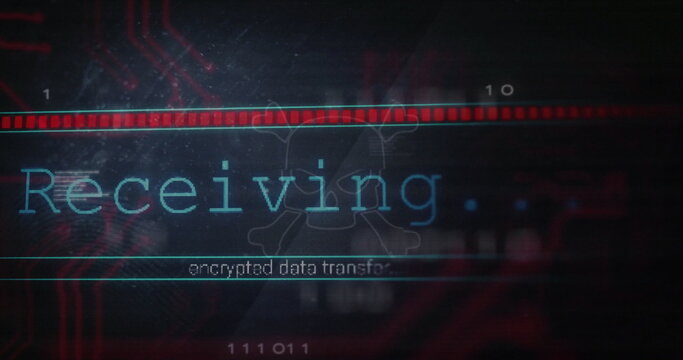 Displaying glowing cyan Receiving… interface on screen, with red progress bar and skull watermark