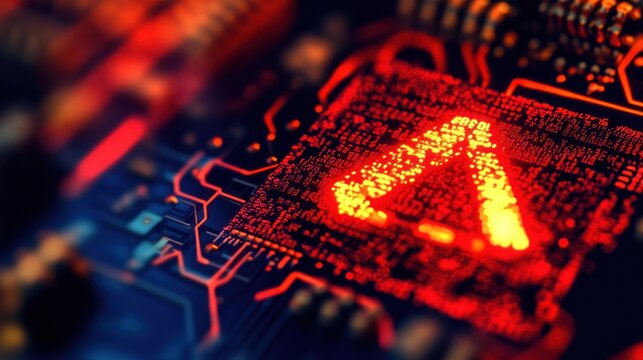 Macro view of a futuristic circuit board or microchip with glowing data streams and technological details in warm colors on a dark background. Suitable for technology, artificial intelligence themes