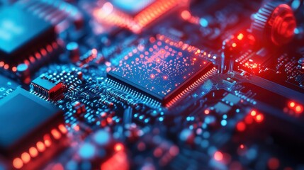 Futuristic circuit board with glowing technology microchips