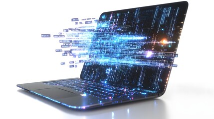 Laptop with Blue Circuit Board and Data Flow on Screen