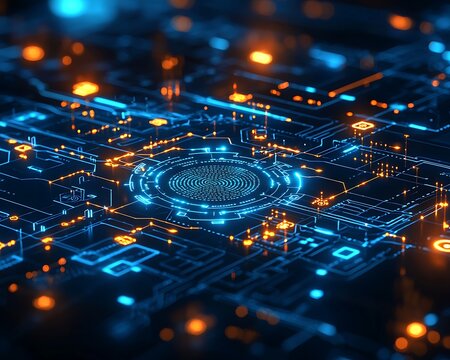 Futuristic circuit board with neon blue and orange electric connecting lines