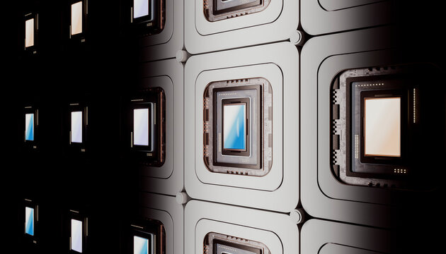 Close up of a glowing central processing unit on a circuit board with illuminated components