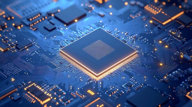 Futuristic circuit board with glowing technology microchips