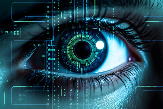 Female eye with overlay of printed circuit board. Concepts of Artificial intelligence development or Microchip implants.