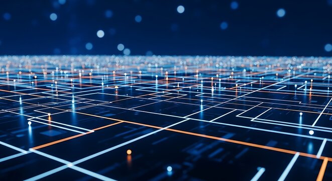 Abstract digital grid network with glowing lines and bokeh lights representing data flow and connectivity