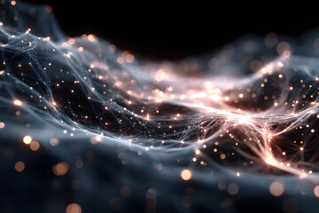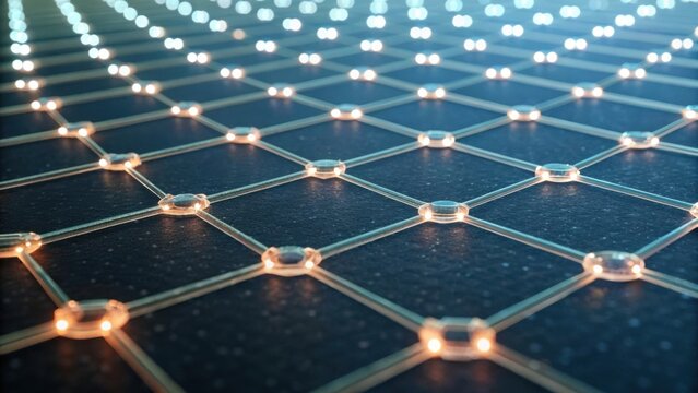 A futuristic grid pattern with illuminated nodes, showcasing a network-like structure against a dark background.