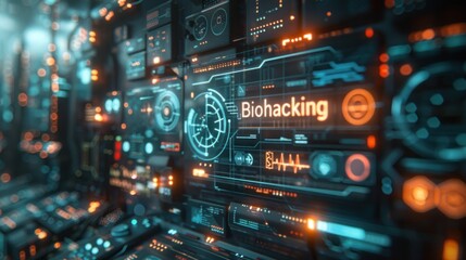 A futuristic interface displays data and graphics related to biohacking, showcasing a blend of biology and technology