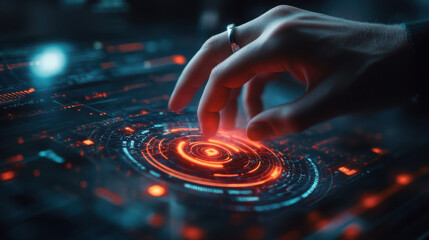 A hand interacting with a glowing futuristic interface featuring circular orange and blue elements on a dark surface
