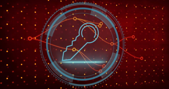 Highlighting key icon in concentric rings on digital interface, with data lines and glowing squares