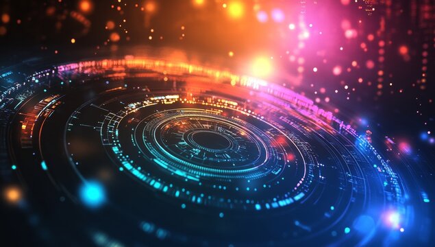 Futuristic digital technology background with a vibrant circular interface and neon light effects in a virtual data space.