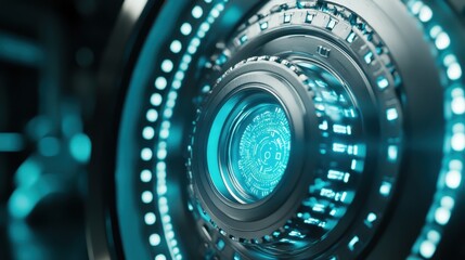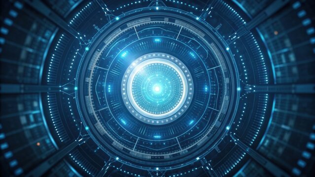 A futuristic, circular design with glowing blue elements, resembling a high-tech interface or digital technology concept.