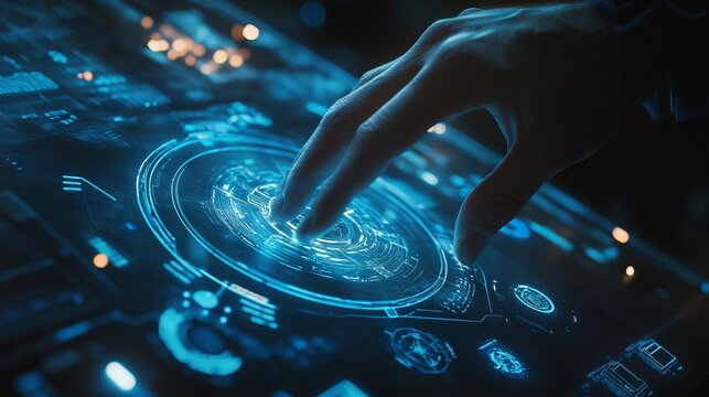 Hand interacting with a futuristic holographic interface with glowing blue elements and circular designs