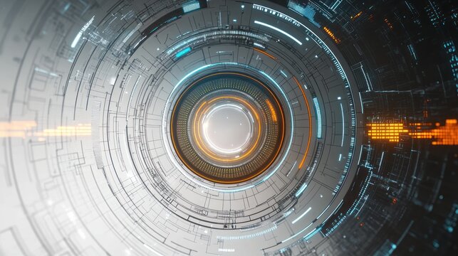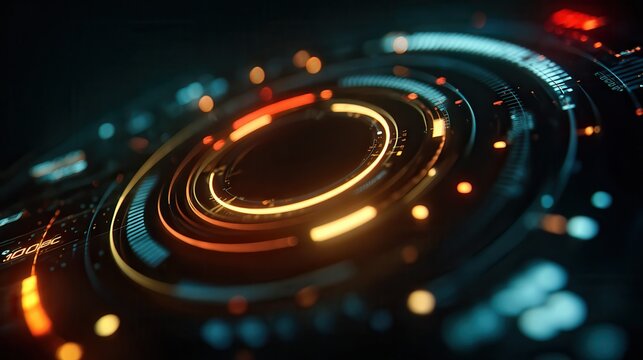 Abstract futuristic digital circular interface with glowing orange and blue elements conveying technology and innovation