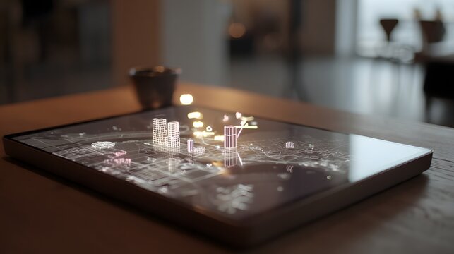Urban City Skyline with Location Pins - Night Scene Featuring Modern Buildings, Glowing Lights, and Digital Elements for Navigation and Mapping