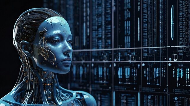 Concept of artificial intelligence, showcasing a futuristic visualization of big data. A blue wave of cyber technologies flows alongside a robotic humanoid face, symbolizing digital evolution