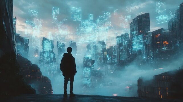 Silhouette of a Person Gazing at a Futuristic City with Glowing Digital Overlays