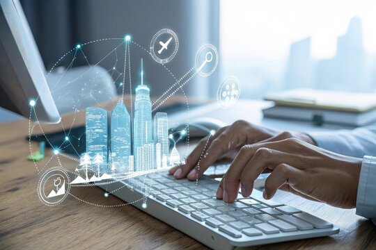 Hands typing on a keyboard with a futuristic holographic city overlay and data visualizations