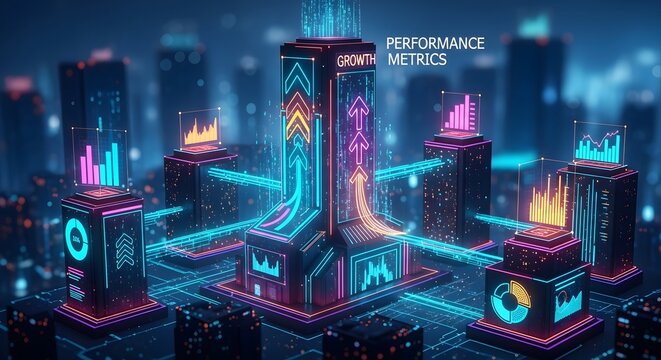 Futuristic cityscape with glowing neon skyscrapers and data visualizations representing performance metrics