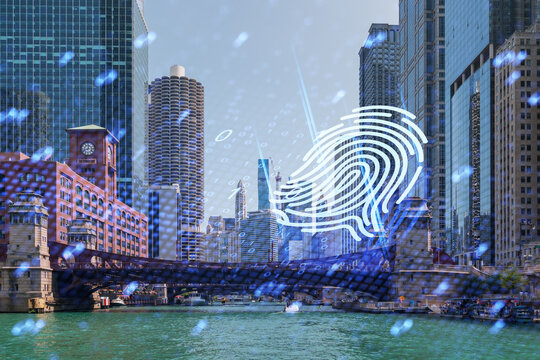 Digital fingerprint over Chicago cityscape at night.