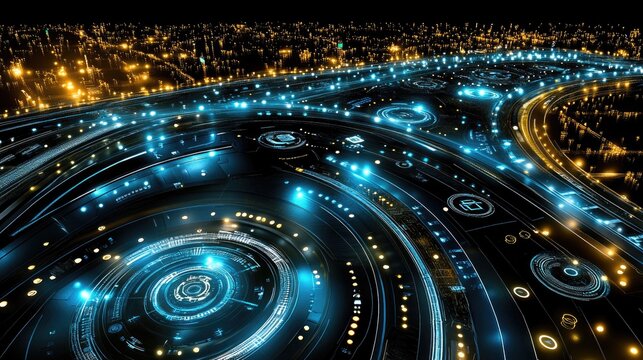 Futuristic city highway at night, glowing with digital interfaces and data streams