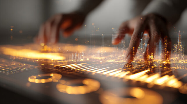 Fingers interact with a glowing digital interface, overlaid with a cityscape at night, suggesting technological control and urban development, symbolizing innovation and progress