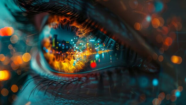 eye reflects digital technology and a futuristic cityscape, symbolizing AI's role in shaping urban life.