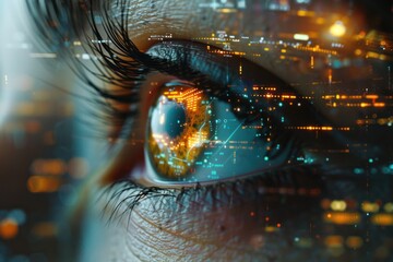 Eye Surveillance and Security Cityscape reflected in an eye, surveillance cameras and digital grids overlaid, focus on urban surveillance and monitoring