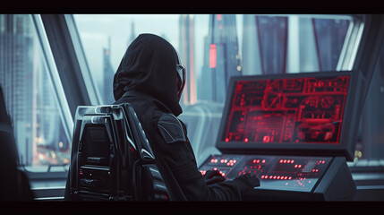 Robotic interaction with data interface urban environment digital art evening cityscape futuristic concept