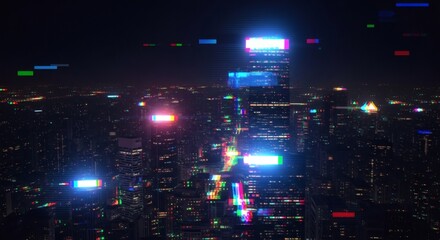 Retro Glitch Effect Dystopian Neon Night Cityscape with a Digital Distortion Overlay
