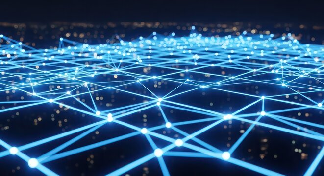 Luminous Blue Plexus Network Weaving Over a Glimmering Night Cityscape