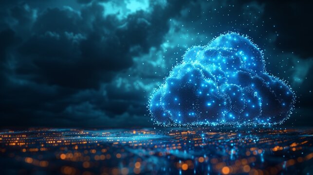 A glowing cloud with interconnected nodes hovers over a cityscape at night, symbolizing digital connectivity and cloud computing.