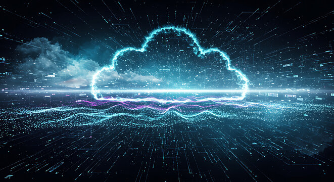 Close-up of hands typing on a laptop with a glowing cloud icon and digital data flow symbols representing cloud computing technology.