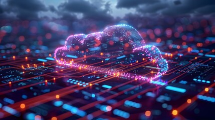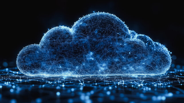 A glowing cloud with blue and red lights. The cloud is surrounded by a dark background. Concept of technology and innovation