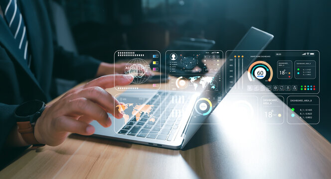 AI Technology. Businessman touch brain working data and Algorithm of Artificial Intelligence in the future business and coding software development synchronize network connection, Data science.