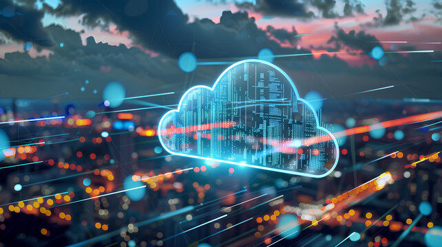 A cloud of data is projected onto a city skyline. Concept of technology and its impact on urban environments. The bright lights of the city and the glowing cloud of data suggest a futuristic