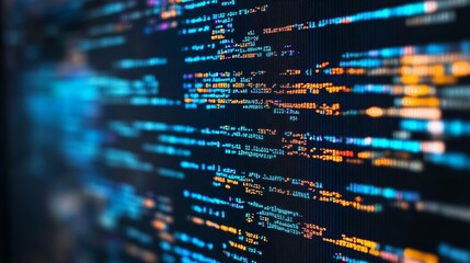 Digital representation of binary code flowing in abstract matrix, showcasing data transmission and technology. vibrant orange tones create dynamic visual effect