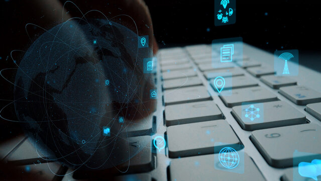 A close-up view of hands typing on a keyboard with floating digital icons and a globe overlay, illustrating the concept of global connectivity and modern technology. Xenic