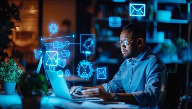 Woman is working intently on a laptop in a dark office environment, surrounded by glowing digital graphics and interface elements
