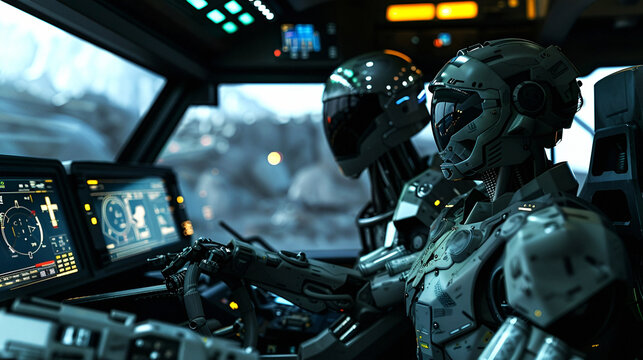 Futuristic robot pilot in spacecraft cockpit overlooking alien terrain