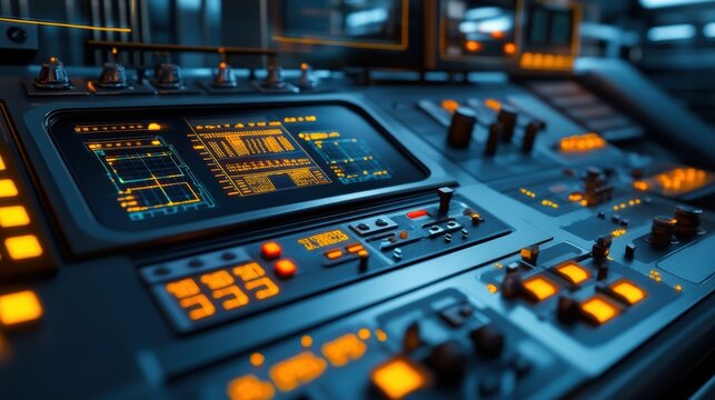 Complex data is displayed on a futuristic control panel with glowing orange lights and intricate details, suggesting advanced technological capabilities in a sophisticated environment