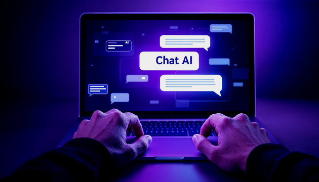 Man typing on laptop with futuristic digital interface and glowing technology in background