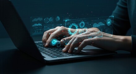 A person in a suit typing on a laptop keyboard with digital data visualizations overlayed, symbolizing technology, data analysis, and business intelligence