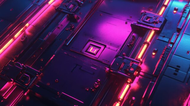 Illuminated integrated circuits display vibrant neon edges on a complex electronic board