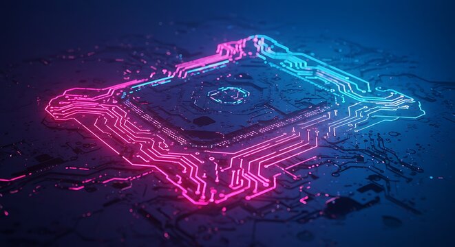 Abstract futuristic circuit board background with vibrant pink and blue neon lights.